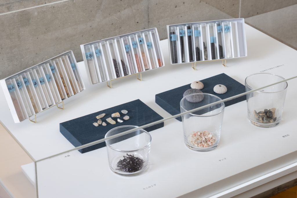 加藤:今回の展覧会へ向けた打合せの中で、今度高知へ行ってウニを顔料にしてみようと思っているというお話を聞いた時はびっくりしましたが、 実際に作品を観たらとても綺麗な色ですね。高知の滞在制作ではウニの他にも、水晶などの鉱物も収集されていて、そういった自然物も資料コーナーで展示しています。