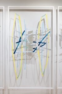 谷内:実は、四角形にたどり着いたきっかけもプリズムです。 四角形の形を絵に写していると、平面だけど奥行きを感じるなど不思議な感覚が四角という形態にはあり、そして(複数の)四角形を重ねると最初は見えていなかった奥行きが見えてくる。そういったドローイングの中で起こっていることは、 描いている人は(途中の過程や変化を通して)知っているけれど、 出来上がったものからはあまり感じられない。そのような経験から、この作品では観る人が動くと影と絵の角度も変わり、見え方が変化する、影も含めることで(そういった経験が)生まれないかなという考えもありました。