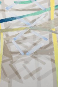 谷内:はい、黄色の形は光の動きのようなイメージが最初にあります。 プリズムから分光した虹の光そのものを描いているのではなく、プリズムの光を使って部屋の中で遊んだ時に光がチラチラ動く感じを記憶していて、 その動きだったり、光がたどる空間の感覚だったりを絵の中で置き換えて成立できないかと考えています。また、画面の奥にある帯状(グリーンとブルーの部分)をグラデーションにしているのは若干その時の記憶から来ています。